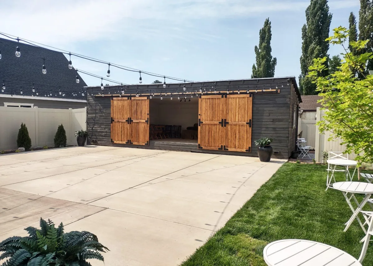 The little separate building on the backside of the outdoor patio functions as additional outdoor seating, or the perfect stage for musicians to perform. Power is available for amps and lighting.