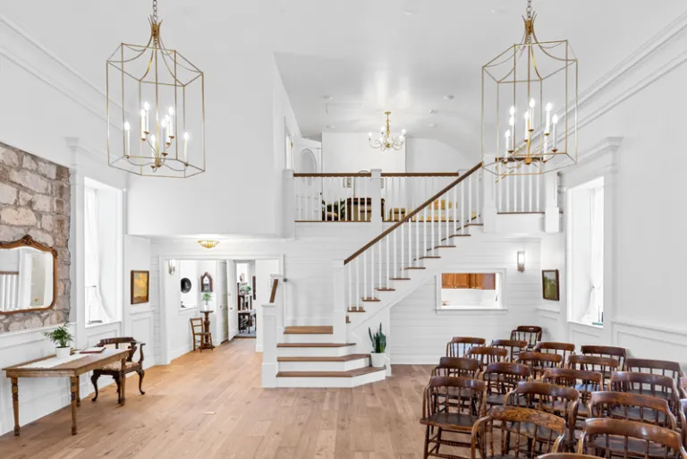 Large windows and chandeliers under an arched ceiling create the perfect backdrop for an intimate wedding ceremony or reception. This is also where you’ll ring the bell! The reception hall is the largest indoor space at the venue, with space to seat over 100 guests without tables or 60 guests with tables. The natural acoustics also make this space an excellent choice for music and dancing.