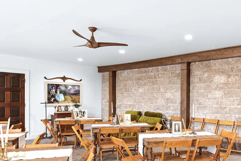 This unique space acts as an indoor-outdoor bridge between the chapel and the outside patio. Multiple glass French doors make the space bright, and when opened merge with the outdoor patio to create one large space. The beautiful exposed stonework and wood columns (as well as the 55-inch TV) make this a popular space for family lines at wedding receptions.